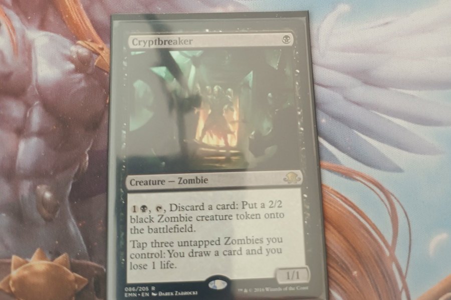 Kortet Cryptbreaker från Magic the Gathering. Mana: 1 svart. Typ: Varelse - Zombie. Styrka/Tålighet: 1/1. Text: 1 svart, T, kasta ett kort: Lägg en 2/2 svart Zombie varelsetoken på slagfältet. Tappa tre oförstörda Zombies du kontrollerar: Du drar ett kort och förlorar 1 liv. Set: EMN. Nummer: 086/205. Sällsynthet: R. Konstnär: Darek Zabrocki.