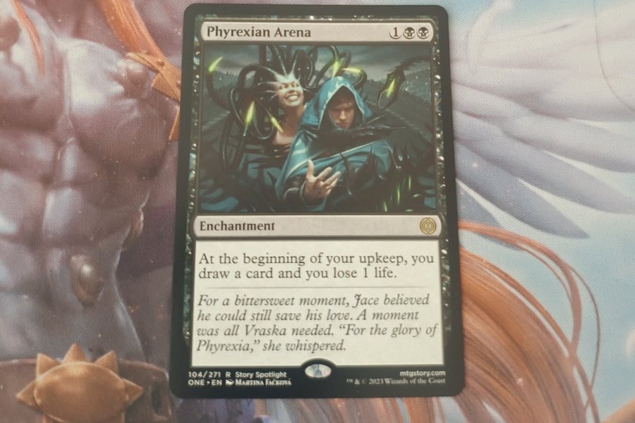 Phyrexian Arena från Magic the Gathering. Kortet är ett enchantment som låter dig dra ett kort och förlora 1 liv i början av din upkeep. Kortet är numrerat 104/271 och är en del av Story Spotlight-serien, illustrerad av Martina Facková.