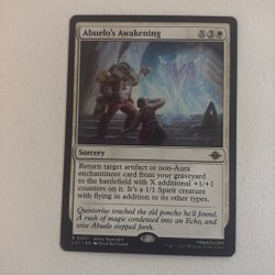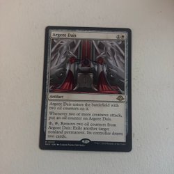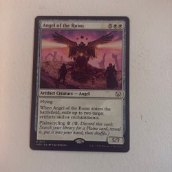 Kortet "Dust Animus" från Magic The Gathering. Det är en varelse av typen Ande med flygförmåga. Om du kontrollerar fem eller fler oförstörda länder, kommer Dust Animus in på slagfältet med två +1/+1-räknare och en livlänksräknare. Du kan också "Plot" kortet genom att betala 1 mana och exilera det från din hand för att senare kasta det som en sorcery utan att betala dess manakostnad. Plot kan endast användas som en sorcery.