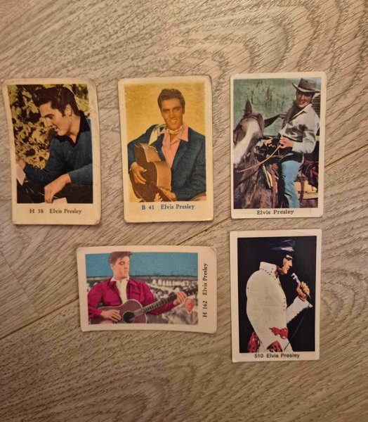 Elvis Presley kort. Inkluderar kort B 41, H 38, H 162 och 510. Kort 510 i fint skick, övriga i använt skick. Skrivet på baksidan på alla. Obs! Elvis till häst är sålt!