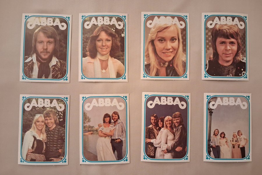8 st samlarkort med ABBA-medlemmarna. Korten föreställer Agnetha Fältskog, Anni-Frid Lyngstad, Björn Ulvaeus och Benny Andersson, både individuellt och som par samt hela gruppen. Tomma baksidor på korten.