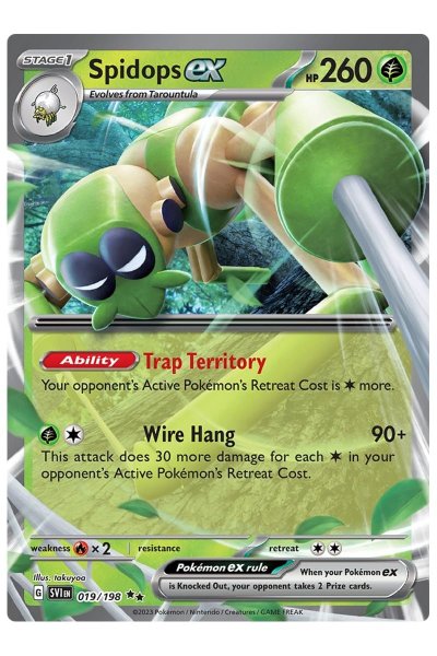 Spidops ex fra Scarlet & Violet Base Set er et sjældent Ultra Rare EX-kort med 260 HP. Dette kort udmærker sig med sin evne til at begrænse modstanderens bevægelser, hvilket gør det til en strategisk tilføjelse til dit deck, perfekt til at kontrollere kampens flow.