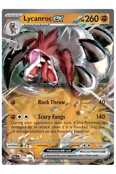 Lycanroc ex 117/193 fra Scarlet & Violet: Paldea Evolved byder på Hele 260 HP og er en ultra rare korttype.