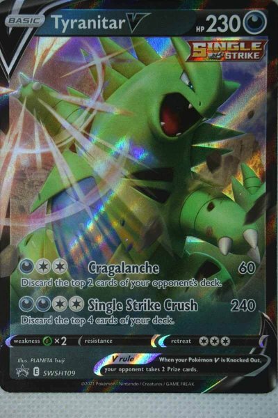Pokemon Tyranitar V SWSH109 fra serien: Battle Styles der udkom i marts 2021. Kortet kommer fra: V Strikers Tin med Tyranitar.
