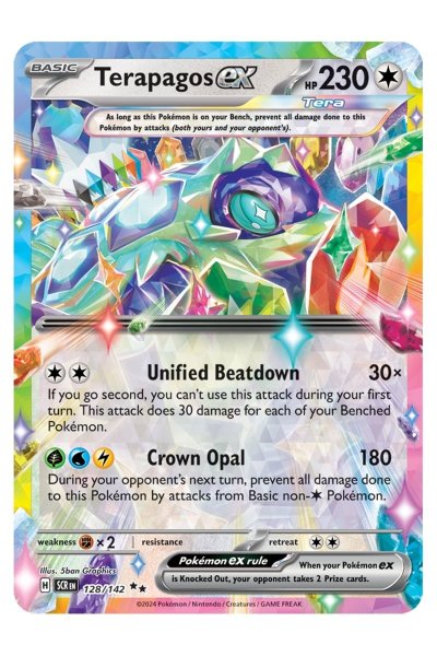 Terapagos ex 128/142 er et Double Rare-kort fra Scarlet & Violet: Stellar Crown med 230 HP. Dets angreb Unified Beatdown giver 30 skade for hver Pokémon på din bænk, mens Crown Opal leverer 180 skade og beskytter mod angreb fra Basic ikke-Colorless Pokémon i næste tur. Kortets Tera-evne forhindrer al skade, mens det er på bænken.