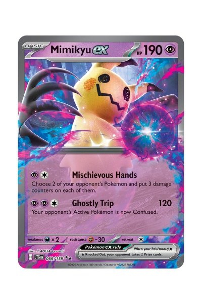 Mimikyu ex 69/159 fra udvidelsen Scarlet & Violet: Journey Together er et Basic Psychic-type kort med 190 liv, sjældenheden Double Rare. Angrebet Mischievous Hands lader dig vælge to af modstanderens Pokémon og placere tre skadebrikker på hver. Med Ghostly Trip gør kortet 120 skade og forvirrer modstanderens aktive Pokémon. Kortet kombinerer taktisk skadeplacering og statusmanipulation til både spil og samling.