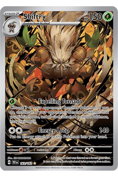 Shiftry 163/162 er et Full Art Pokémon-kort fra Scarlet & Violet: Temporal Forces med 150 HP og stærke angreb. Kortet fremhæver pokémonen Shiftry med kortets unikke design og fantastiske holo. Perfekt til spillere og samlere!
