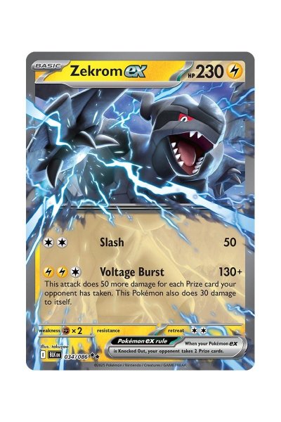Zekrom ex 034/086 er et kraftfuldt lyn-Pokémon-kort fra Scarlet & Violet: Black Bolt, med 230 HP. Det har angrebet Slash (50 skade) og Voltage Burst, som laver mindst 130 skade + 50 for hver præmie modstanderen har taget, men koster dig også 30 skade. Kortet har sjældenheden Double Rare og fremstår med klassisk holo finish – en attraktiv kombination af samler- og kampværdi.