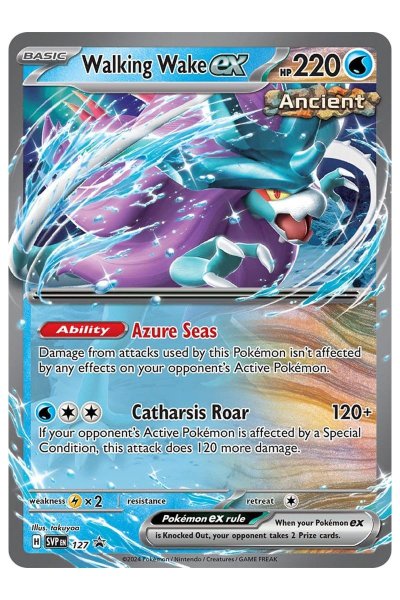 Walking Wake ex 127 er et vand-Pokémon-kort med 220 HP fra Scarlet & Violet: Black Star Promo-serien. Kortet har evnen Azure Seas, som ignorerer skadebegrænsende effekter på modstanderens aktive Pokémon, og angrebet Catharsis Roar, der laver 120+ skade, hvis modstanderens aktive Pokémon har en specialtilstand. Som et promo-kort er det sjældent (“Promo”) og er designet med flot holo foil af kunstneren takuyoa.