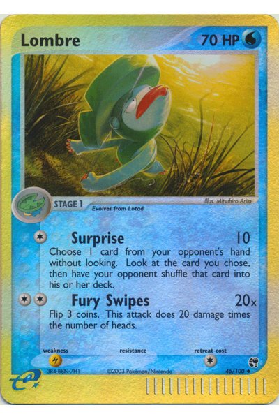 Lombre 46/100 er et Reverse Holo-kort fra udvidelsen EX Sandstorm, som udkom den 18. september 2003. Sættet er en del af EX-æraen og introducerer Pokémon fra Hoenn-regionen i klassisk Wizards/EX-stil. Reverse Holo-versionen har holoeffekt på kortets baggrund, hvilket gør den mere eftertragtet end standardudgaven og populær blandt samlere af ældre EX-kort.