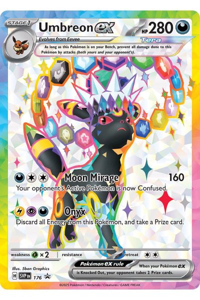 Umbreon Full Art ex SVP176 fra Scarlet & Violet: Black Star Promos er et sjældent Full Art promo-kort med 280 liv og det kraftfulde angreb Moon Mirage (160 skade). Dette smukt designede kort med en holografisk, kunstnerisk illustration af Umbreon er et must-have for både samlere og spillere. Dens evne til at skabe strategiske forvirringseffekter gør den ideel til at forstyrre modstandernes spil. Perfekt til at styrke dit deck eller din samling.
