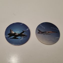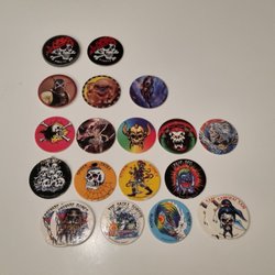 Säljer en samling av olikformade pogs.
