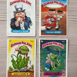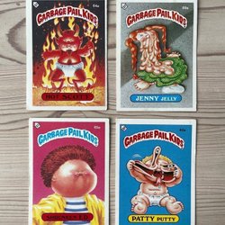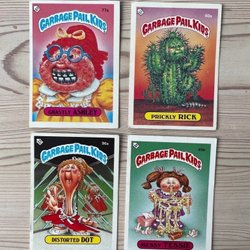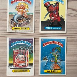 Samling av Garbage Pail Kids-kort från 1986 års serie. Inkluderar karaktärerna Tooth Les 140b, Incomplete Pete 149b, Woody Alan 125b och Low Cal 128b. Perfekt för samlare av klassiska samlarkort. Skick enligt bilder.