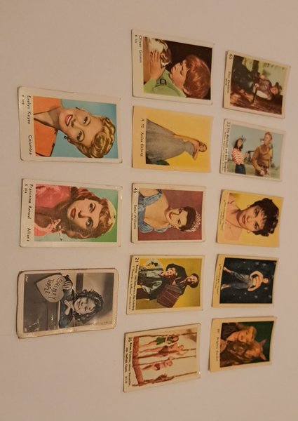 Samling av filmstjärnekort med bland annat Brigitte Bardot, Don Dubbins, Elsa Martinelli och Kirk Douglas, Gina Lollobrigida, Oliver Grimm, Anita Ekberg, Ester Williams, Eskil Dahlenius och Åke Grönberg, Shirley Temple, Evelyn Keyes, Francoise Arnoul, Mareen O'Sullivan, Johnny Weissmüller och John Sheffield.
