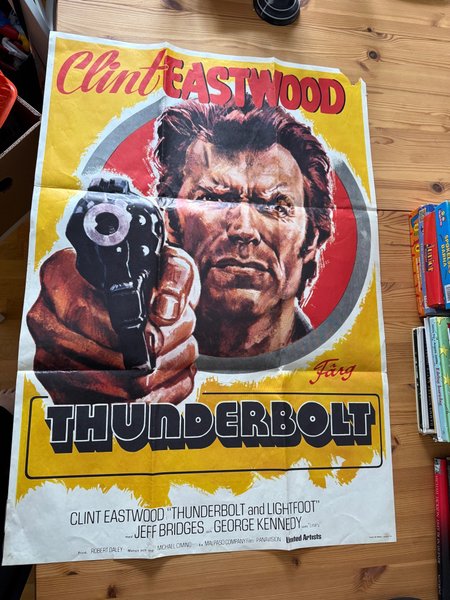 Filmaffisch med Clint Eastwood, Jeff Bridges och George Kennedy. Affischen är för filmen ”Thunderbolt and Lightfoot”.