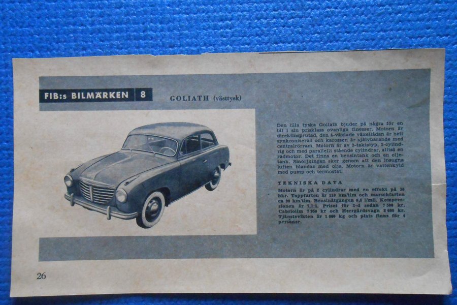 Beskrivning: Urklipp ur FIB:s Bilmärken nummer 8 med presentation av Goliath västtysk personbil. En sida med bild och teknisk information. Texten beskriver den lilla tyska Goliath med direktinsprutad 2 taktsmotor, självbärande kaross med centralrörsram samt 4 växlad växellåda. I den tekniska delen anges bland annat 2 cylindrar, ca 30 hk, toppfart omkring 110 km tim, bränsleförbrukning ca 0,6 l mil och prisuppgifter för olika karosstyper. Format cirka 12 x 22 cm. Tryckt i svartvitt med grå tonplatta, typiskt för serien. Sidnummer 26.