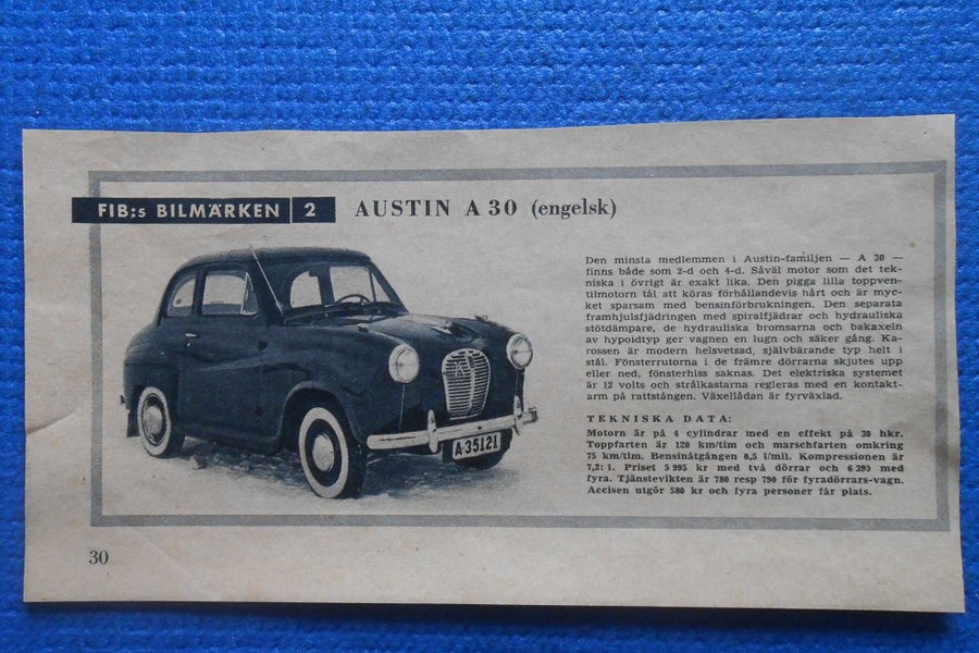 Ursprungligt uppslag ur serien FIB:s Bilmärken, nummer 2, med presentation av Austin A30 – den engelska småbilen som lanserades i början av 1950-talet och blev en viktig modell i Austins folkbilssatsning efter kriget. Här visas bilen i klassisk pressbild tillsammans med samtida svensk faktatext.