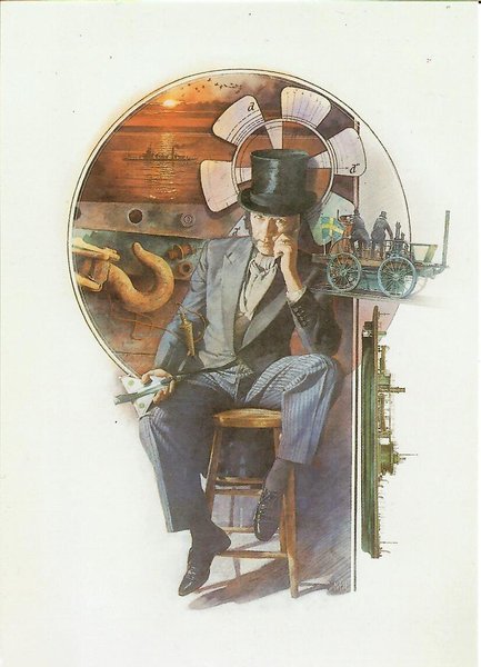 Bild på John Ericsson i hög hatt sittandes på en pall. Bakom honom finns en cirkulär bild med en solnedgång över vatten, en båt, en vagn med en svensk flagga och Johns uppfinning propellern.