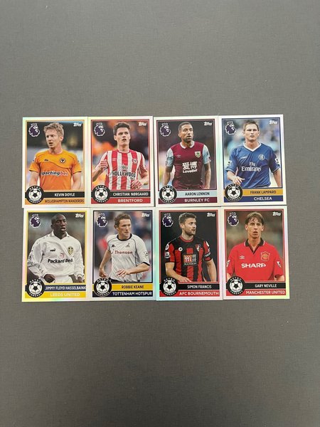 Samling av fotbollskort från Topps Retro Threads-serien. Inkluderar spelare som Kevin Doyle, Christian Nørgaard, Aaron Lennon, Frank Lampard, Jimmy Floyd Hasselbaink, Robbie Keane, Simon Francis och Gary Neville.