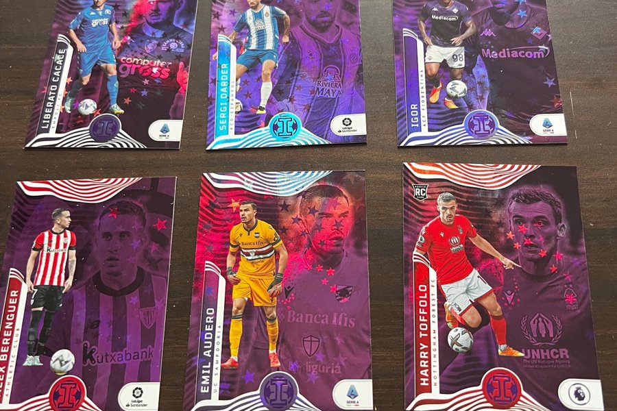 Samling af fodboldkort med forskellige spillere og hold.