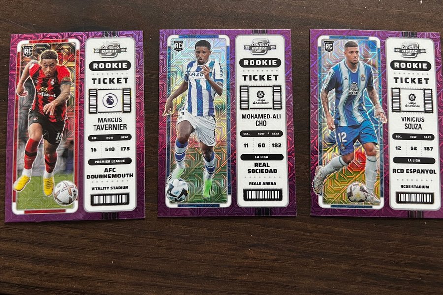 Samling af fodboldkort med forskellige spillere og hold.