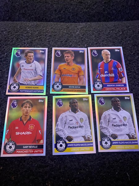 Samling av fotbollskort från Topps Retro Threads-serien. Inkluderar spelare som Robbie Keane, Kevin Doyle, Andrew Johnson, Gary Neville och Jimmy Floyd Hasselbaink.