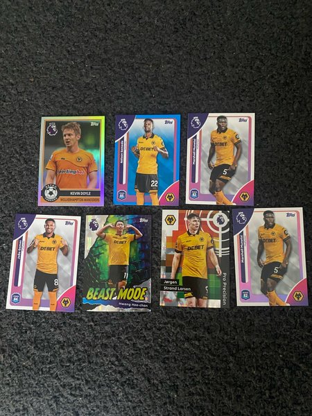Samling av fotbollskort med Wolverhampton Wanderers spelare. Inkluderar spelare som Kevin Doyle, Nélson Semedo, João Gomes, Hwang Hee-chan, Jørgen Strand Larsen och Marshall Munetsi.