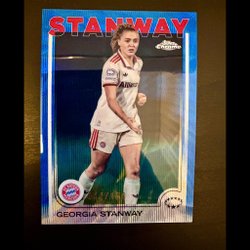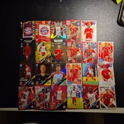 Fotbollskort med spelare från FC Bayern München. Korten inkluderar spelare som Luis Díaz, Alphonso Davies, Michael Olise, Xabi Alonso, Lennart Karl, Robert Lewandowski och Oliver Kahn. Korten är från olika serier som "Roots", "Trophy Chasers", "Mystic Nights", "Ageless Alchemy" och pixelkonstkort.
