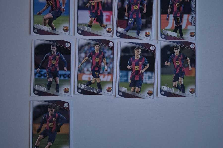 Fotbollskort med spelare från FC Barcelona. Korten inkluderar spelare som Lewandowski, Gavi, Pedri, Raphinha, Ferran Torres, Pau Cubarsi, Junyent, Dro och Fernandez.