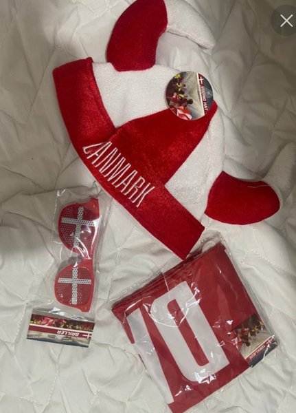Ett roligt set med Danmarkstema! Inkluderar en vikingahatt, ett par glasögon och en halsduk. Perfekt för att visa ditt stöd! oöppnade!