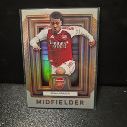 Säljer fotbollskort med spelare från Arsenal. Korten inkluderar Myles Lewis-Skelly, William Saliba och Ben White.