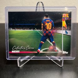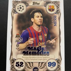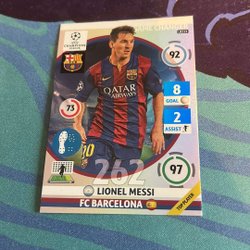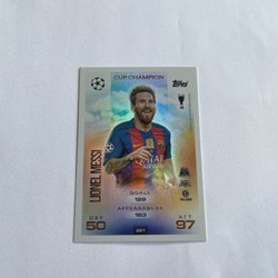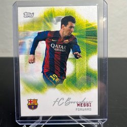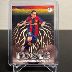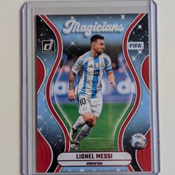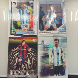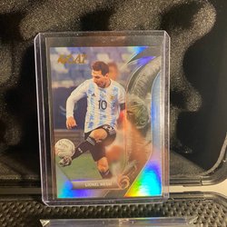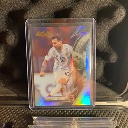 Fotbollskort med Lionel Messi. Kortet visar Messi i olika poser och med texten "Lionel Messi" på framsidan. Baksidan innehåller en kort biografi om Lionel Messi, som beskriver hans karriär och prestationer, samt Futera-logotypen och texten "Futera 2023 All Rights Reserved".