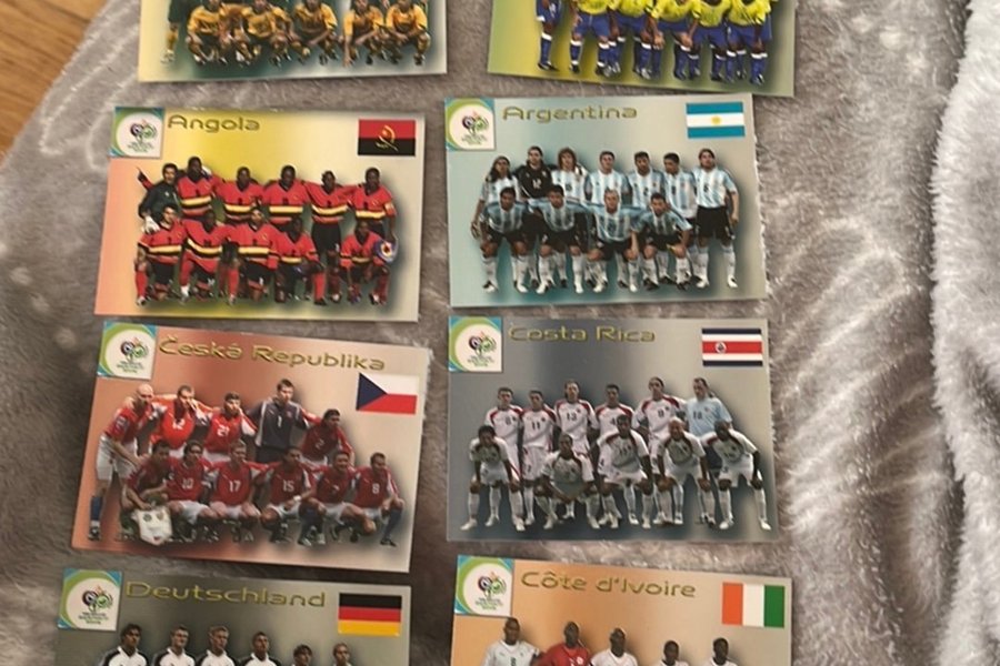 Fotbollskort från VM 2006 med olika landslag. Korten inkluderar lag som Australien, Brasilien, Angola, Argentina, Tjeckien, Costa Rica, Tyskland och Elfenbenskusten.
