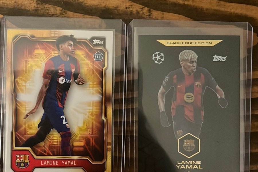 Dette er to Lamine Yamal fodboldkort fra Topps. Det ene kort er en del af Black Edge Edition.