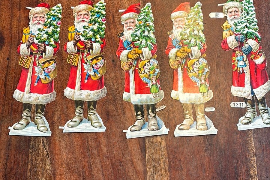Fem stycken gamla bokmärken föreställande jultomtar med julgran och säck fylld med leksaker.