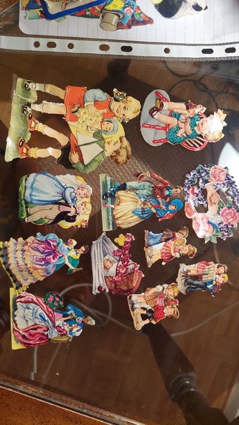 Ett parti med klippdockor i olika motiv. Föreställer bland annat barn, brudpar och figurer i folkdräkter.