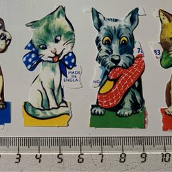 Samlarbilder med hundmotiv. Bilderna är i varierande storlek och föreställer olika hundraser. Baksidan av bilderna har text på flera språk.