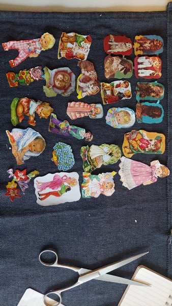 Ett parti med klippdockor och figurer föreställande barn, djur och blommor.
