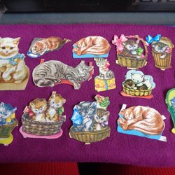 Dessa kattbilder är tryckta på papper. Bilderna föreställer katter i olika miljöer och situationer.