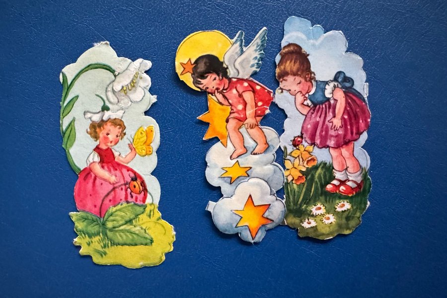 Dessa bokmärken är i en charmig vintage-stil. Motiven inkluderar flickor, änglar, blommor och fjärilar. De är lämpliga för samlare eller för att dekorera.