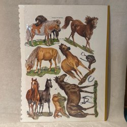 . Bilderna föreställer olika hästar, bland annat en grupp galopperande hästar, en häst med föl, en ensam häst och en cowboy på en häst.