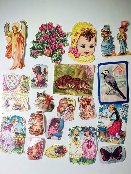 Motiven inkluderar änglar, blommor, barn, djur och figurer.