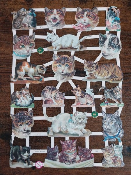 Dessa kattbilder är tryckta i Tyskland och har olika kattmotiv. Bilderna är utstansade och redo att användas för dekoration eller pyssel.