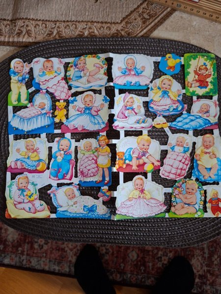 Bilder med baby-motiv i olika utföranden. Motiven inkluderar bebisar i sängar, med leksaker och i olika kläder. Färgerna är ljusa och pastellfärgade.