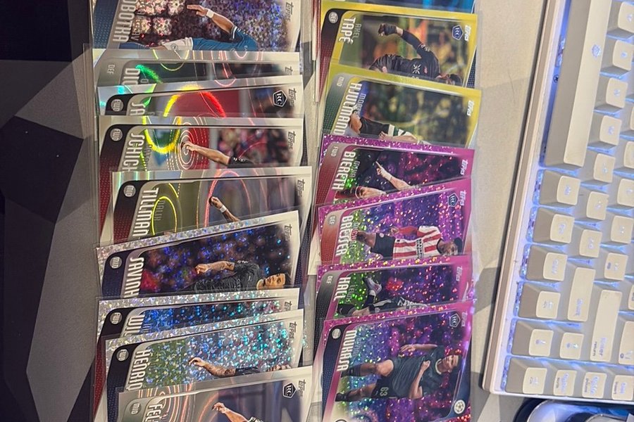 Samling av fotbollskort från Topps. Inkluderar spelare som Felicissimo, Henrio, Wil, Savinho, Tillman, Schich, Lobotka, Muras, Mukasa, Hall, Breiser, Biereth, Hjuamani, Tape, Sarco och Tilla.