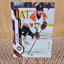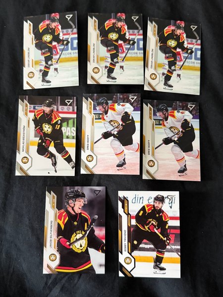 Ishockeykort med spelare som Oskar Lindblom, Nicklas Bäckström, Jakob Silfverberg, Greg Scott och Bobby Trivigno.