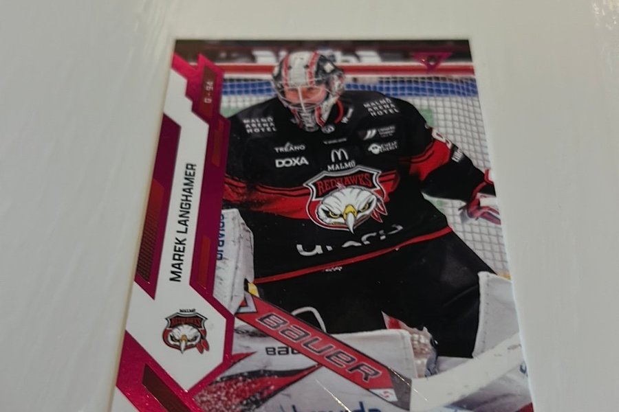 Ishockeykort föreställande Marek Langhamer i Malmö Redhawks-utrustning. Kortet har en rosa och vit design med texten "MAREK LANGHAMER" vertikalt längs vänsterkanten och "G-94" i övre vänstra hörnet.