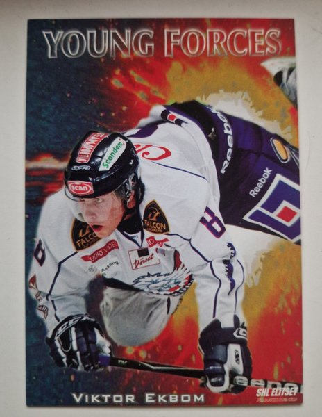 Hockeykort föreställande Viktor Ekbom från Young Forces-serien. Kortet är märkt med "SHL ELITSERIEN".
