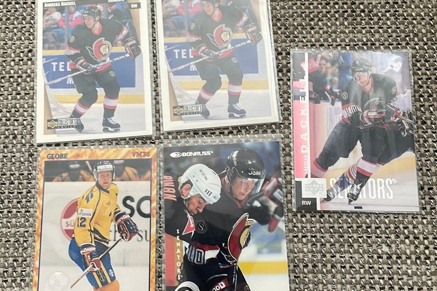 Fem hockeykort med Andreas Dackell. Korten är från olika serier och visar Dackell i olika tröjor, inklusive Senators och Sveriges landslagströja.fd Brynäs