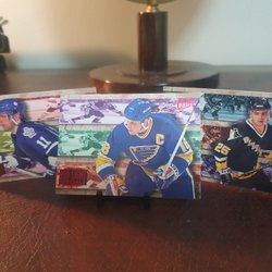 Samling av hockeykort från NHL med spelarna Yashin, Lidström, Yzerman, Hull och Jagr.